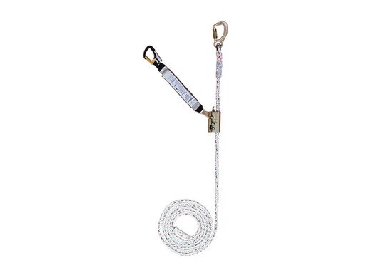 Línea de seguridad vertical flexible de 15 m con pinza de cuerda desmontable, absorbedor de energía y dos ganchos de seguridad para trabajar en altura de forma segura y sencilla.
